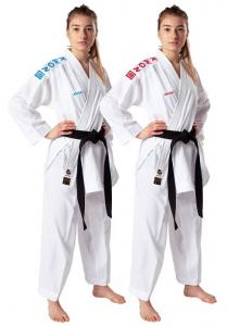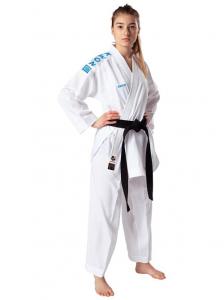 WKF kimono na Kumite vyrobené so 100% mikrovlákna (polyester). Ľahká a pohodlná látka s výraznou štruktúrou a vložkami zo sieťoviny zaručuje vysoký komfort pri nosení. Nohavice s elastickým pásom a šnúrkou.Modré a červené výšivky na ramenách, hrudi a krku.